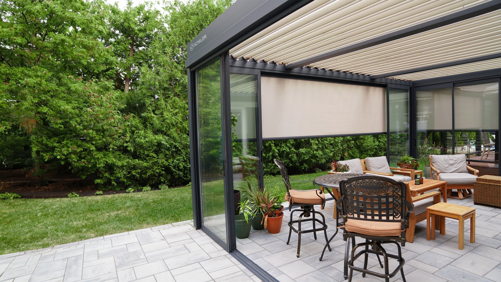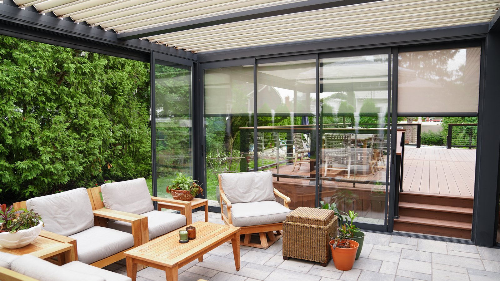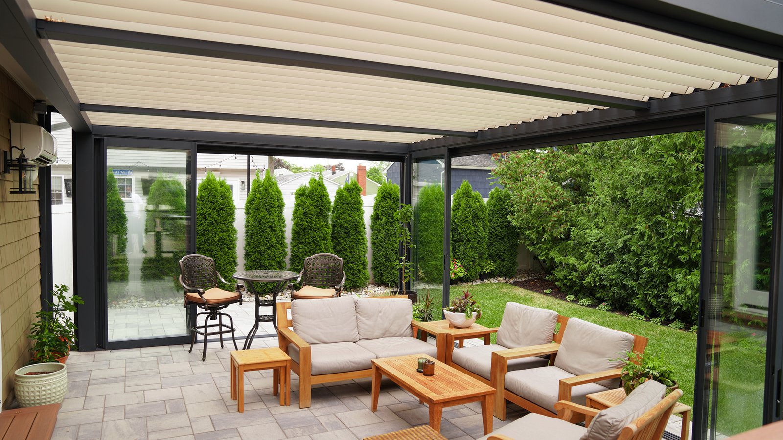 Transform your patio into a true four-season room with a motorized louvered roof, sliding glass walls, and retractable screens—style, shade, and comfort in one system.