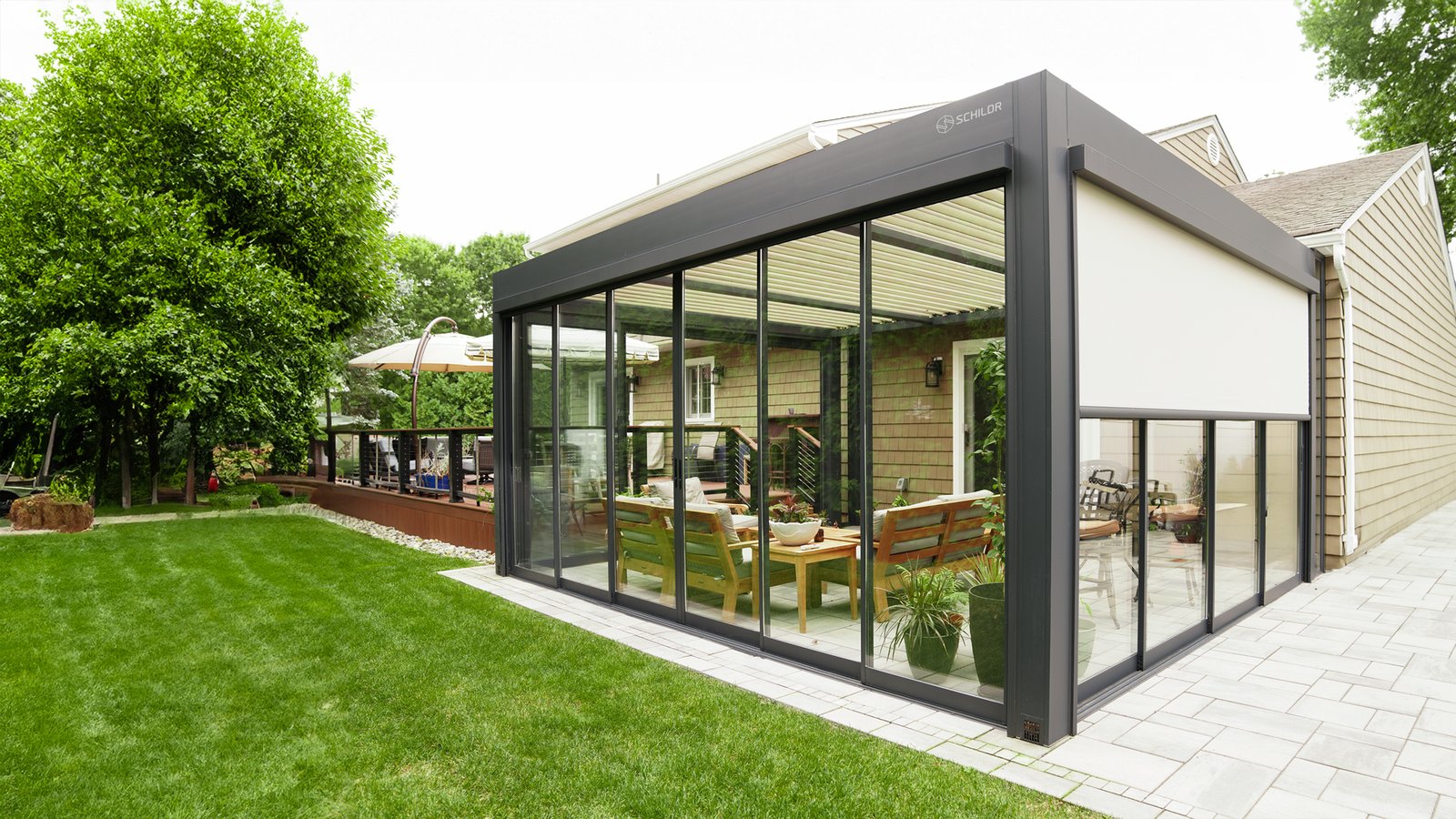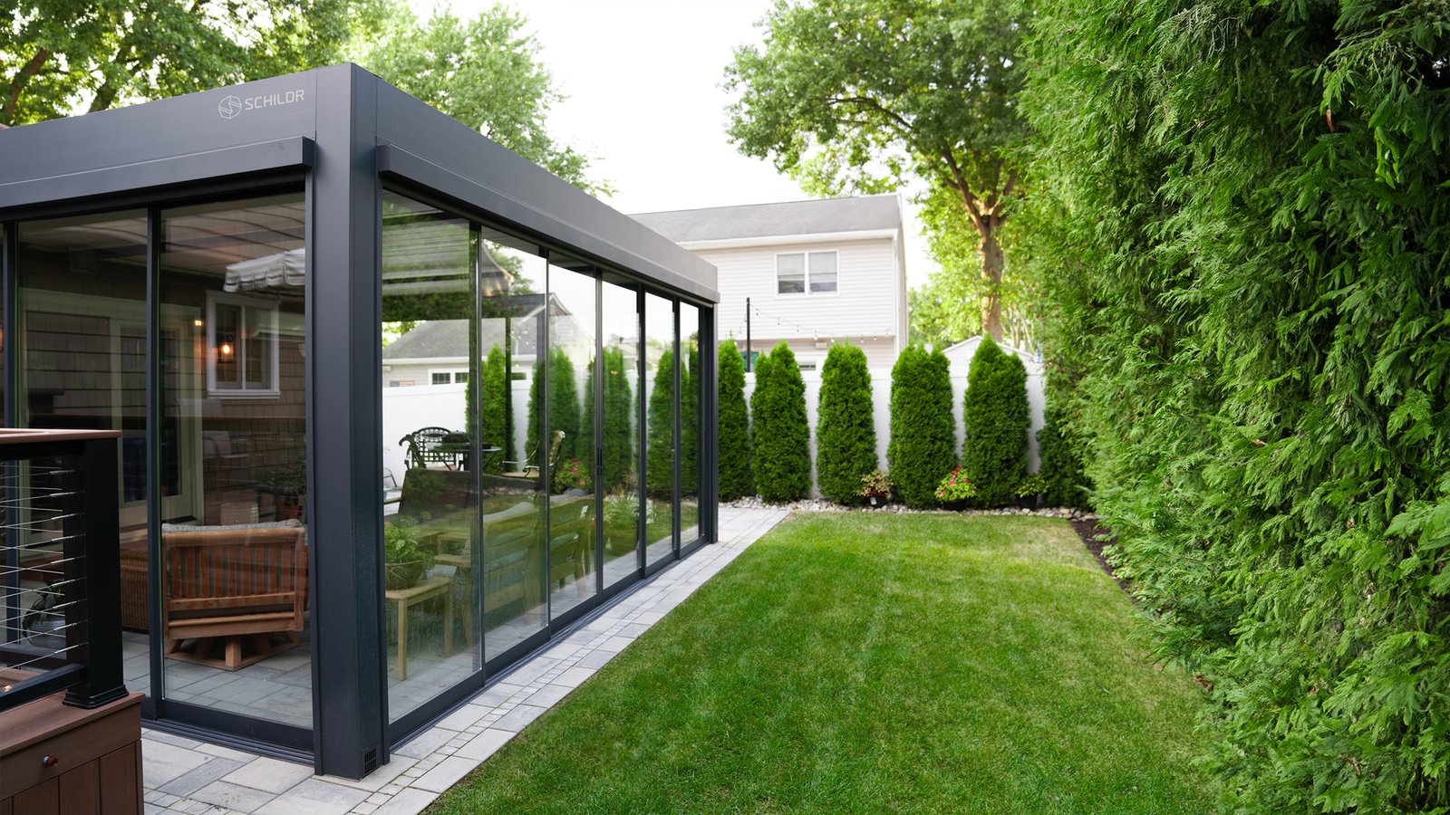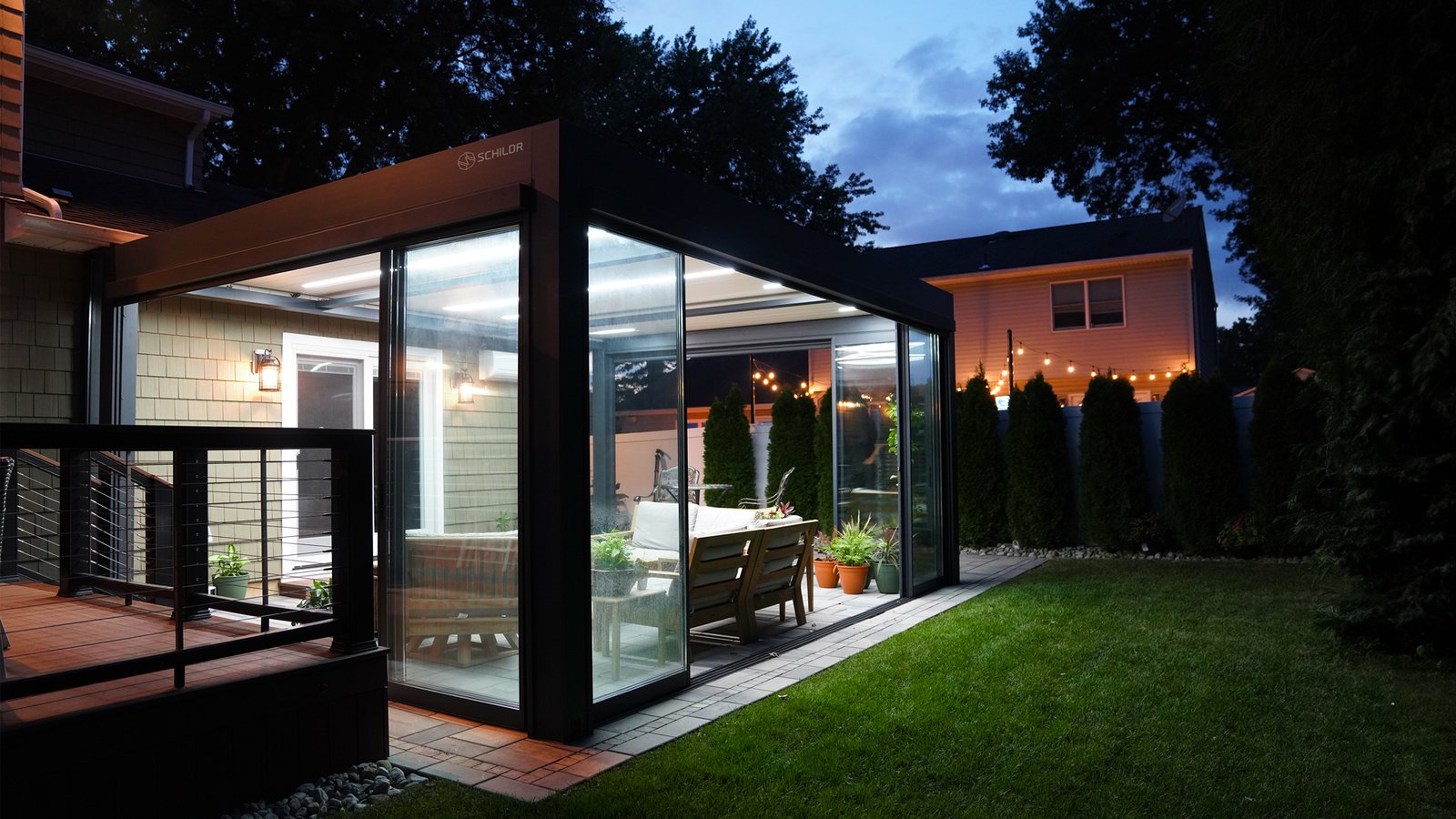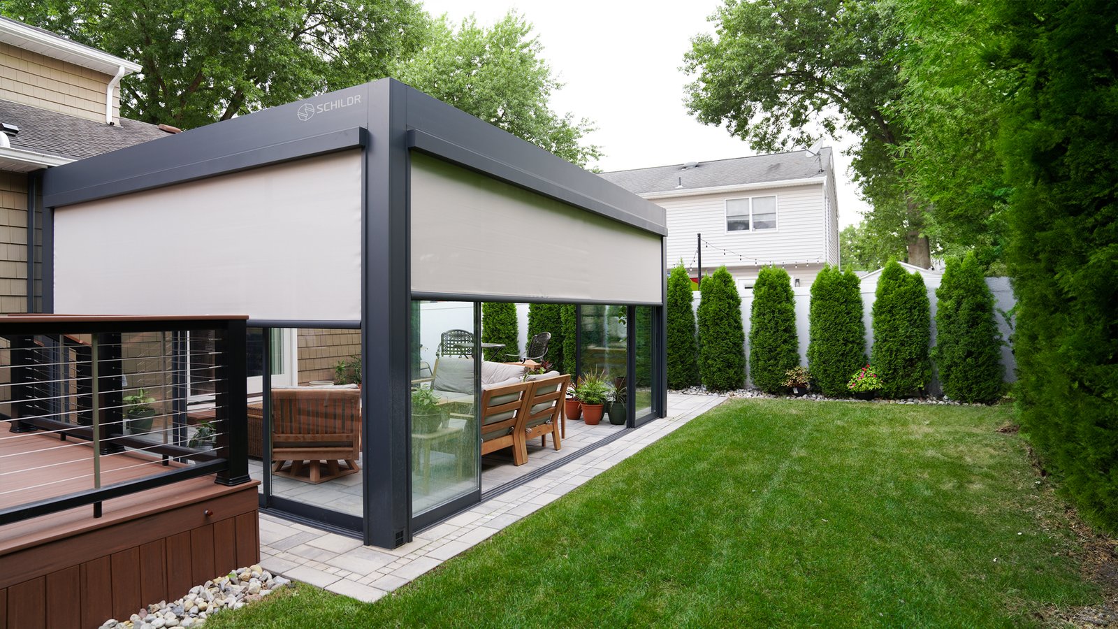 Transform your patio into a true four-season room with a motorized louvered roof, sliding glass walls, and retractable screens—style, shade, and comfort in one system.