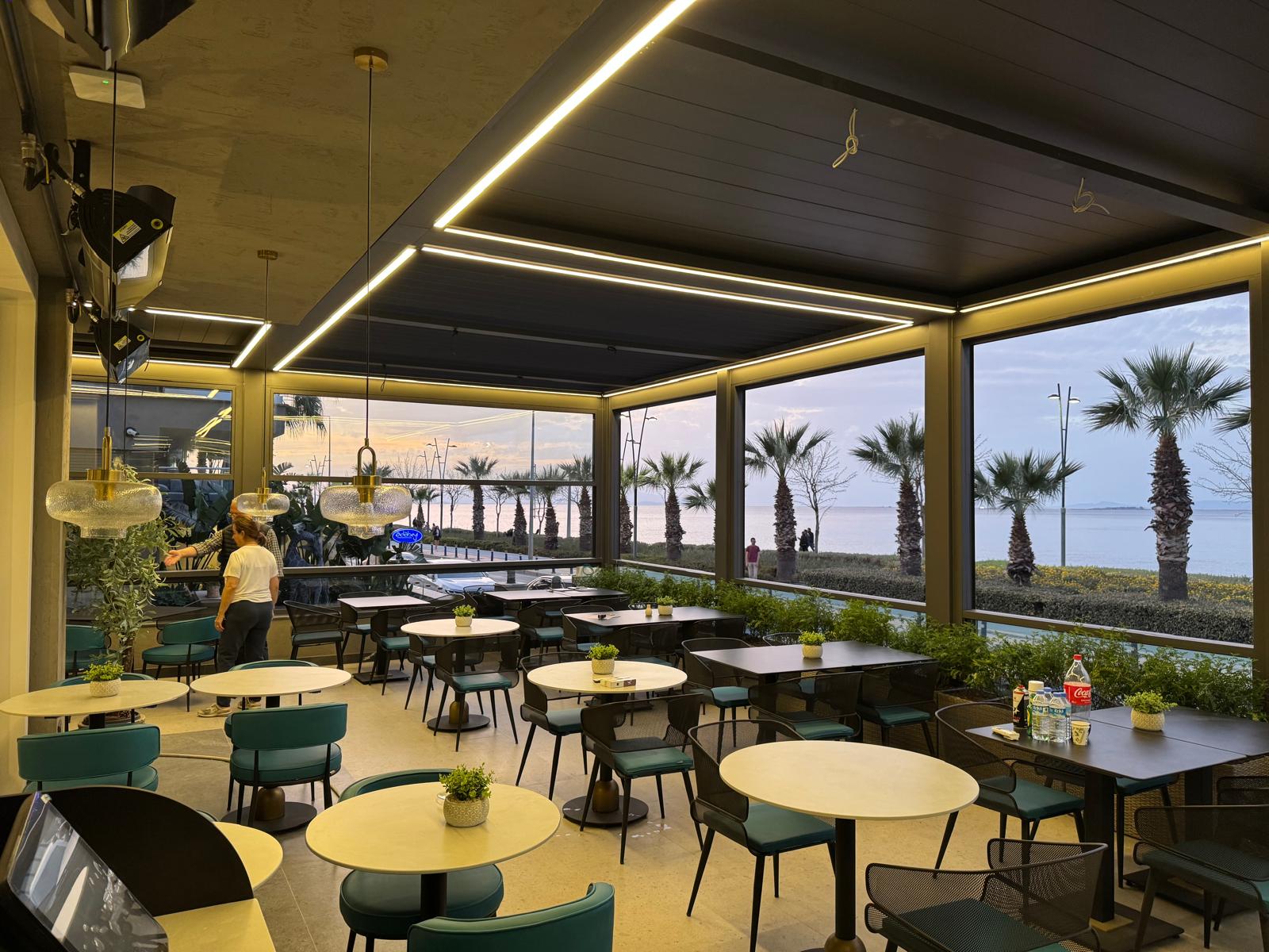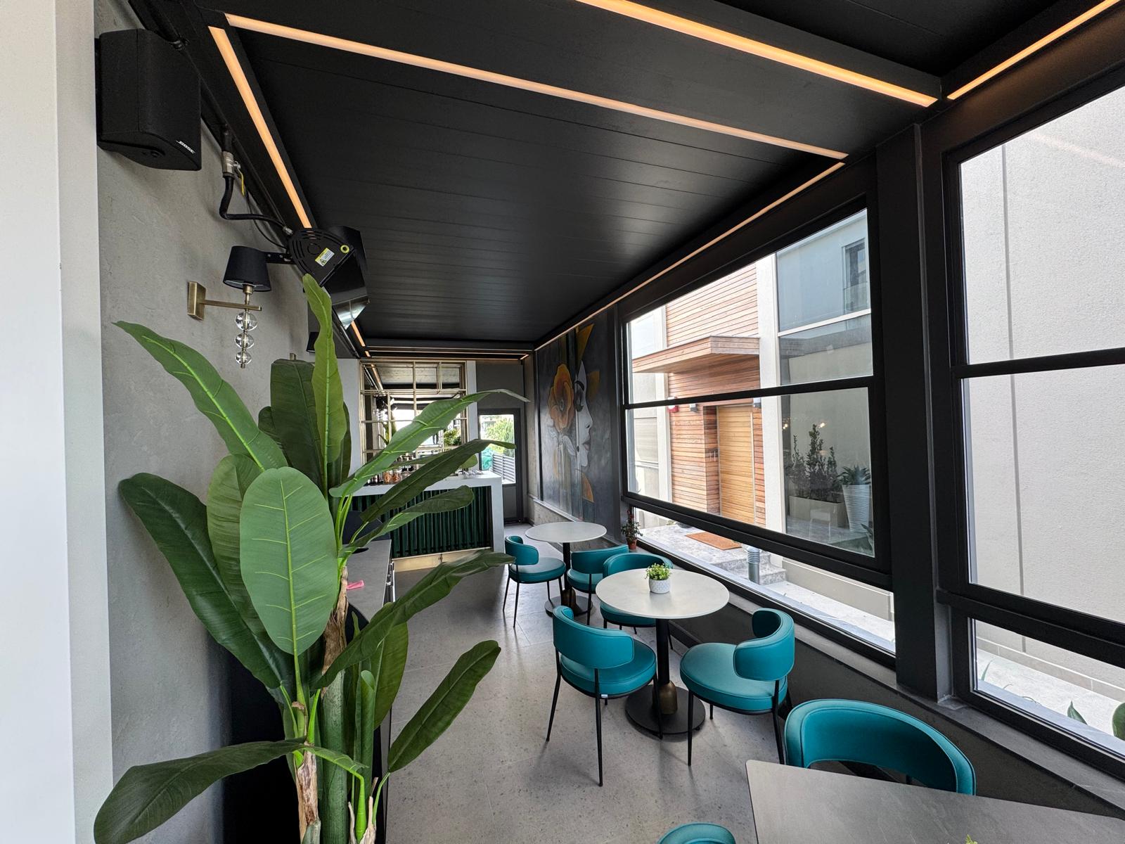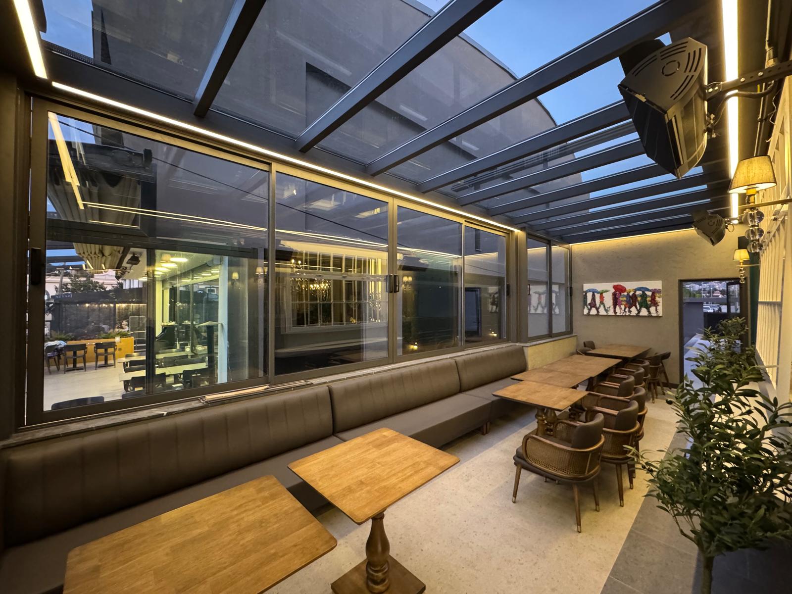 For this restaurant, we designed a complete solution to maximize seating capacity and elevate guest experience. The project features Cabbana, our motorized louvered roof that allows instant shade or sunlight at the touch of a button. Surrounding the structure, a Glass Room enclosure creates a modern, weather-protected space without sacrificing visibility or openness. To enhance airflow and versatility, Compact motorized guillotine windows were integrated, giving the restaurant the freedom to transform from a fully enclosed room to an open-air terrace in seconds.